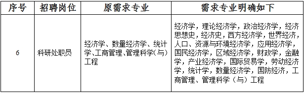 6科研处职员(专业技术岗位)招聘需求专业“经济学”为一级学科,涵盖所有专业