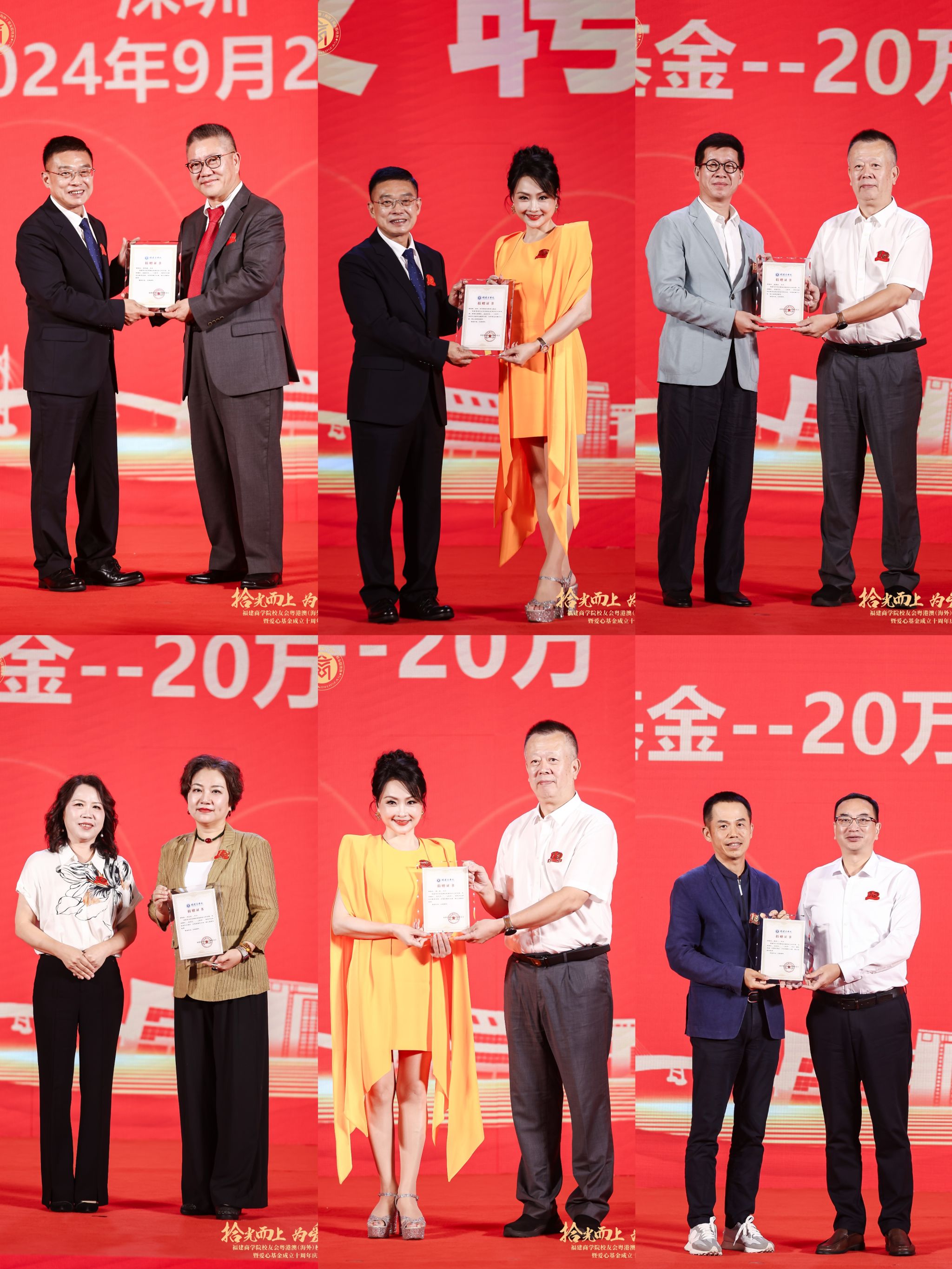 吴访益、刘剑津、徐晓丹、蒲文庆分别向黄忠国、陈英、陈景云、洪文洁、陈学一等校友及粤港澳(海外)校友联络处颁发捐赠证书。