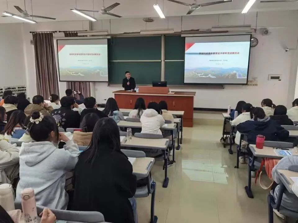 课前,吴访益与学生进行了面对面互动交流,了解学生在新学期的专业学习、校园生活、家庭等情况。讲座中,吴访益引用党的二十大报告中“广大青年要坚定不移听党话、跟党走”等相关内容切入主题,用详实的数据、具体的案例分析了党的二十大报告概括的新时代党和国家事业取得的历史性成就、发生的历史性变革,并结合三年来我国疫情防控的举措和成就,以自身在疫情防控中的工作、生活经历,阐述党和国家政策及措施的科学性、合理性。同时,他通过回顾“五年规划”的发展历程,解读了党的二十大报告中全面建成社会主义现代化强国总的战略安排等相关内容,并结合党的十八大以来党领导人民在脱贫攻坚、科技自立自强等方面取得的成就,引导同学们深刻认识全面建设社会主义现代化国家为新时代青年成长成才提供的前所未有的历史机遇。此外,他还通过讲述习近平总书记在陕北、河北、福建等地工作期间吃苦耐劳、担当作为的奋斗故事,鼓励同学们要通过学习实践,立志做一个有理想、敢担当、能吃苦、肯奋斗的新时代好青年。最后,他用习近平总书记乐于读书、善于读书、勤于读书的故事,勉励大家在学习中要做到爱读书、勤读书、善读书、读好书,努力学习习近平总书记强烈的事业心、真诚的为民情怀等优秀精神品质。